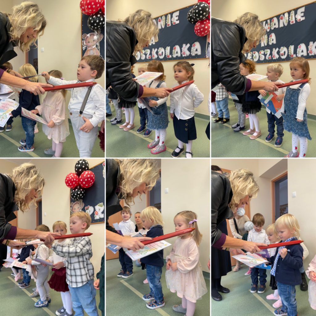 Punktem kulminacyjnym było uroczyste pasowanie na przedszkolaka, poprzez symboliczne położenie specjalnego ołówka na ramieniu dziecka dokonane przez Panią Dyrektor. Na pamiątkę tego ważnego dnia dzieci otrzymały dyplom z pasowania oraz upominek.