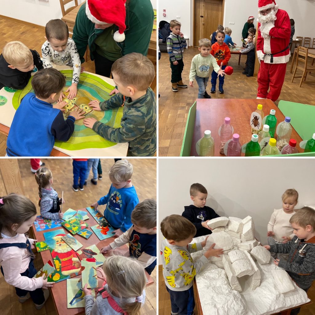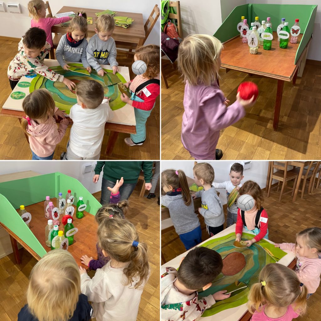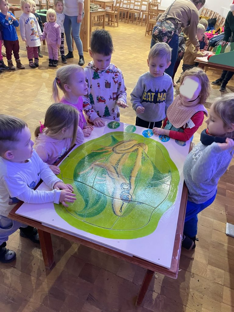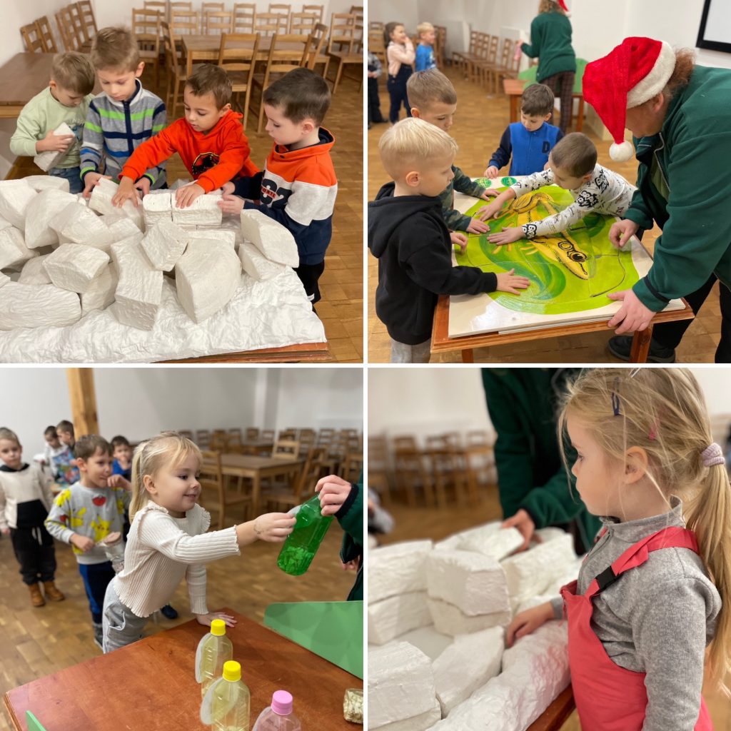 w poszukiwaniu zwierząt, a następnie uczestniczyły w warsztatach, podczas których dowiedziały się, jak zimują płazy. Przedszkolaki dzielnie radziły sobie z zespołowym wykonywaniem zadań. Układały świąteczne puzzle, układanki przedstawiające cykl życiowy żaby, wcielały się w role żab polujących na pożywienie, a nawet budowały igloo.