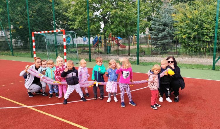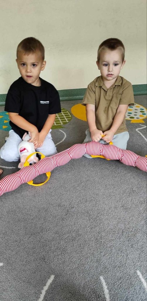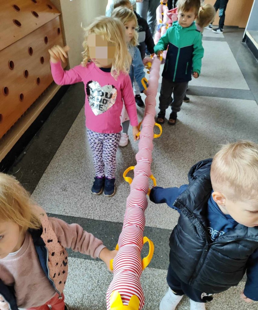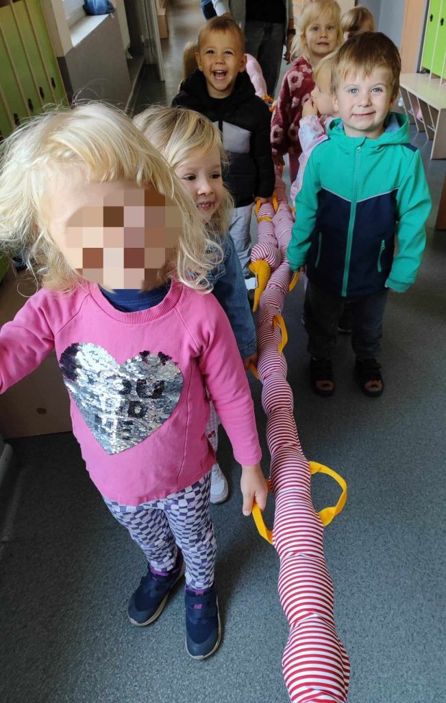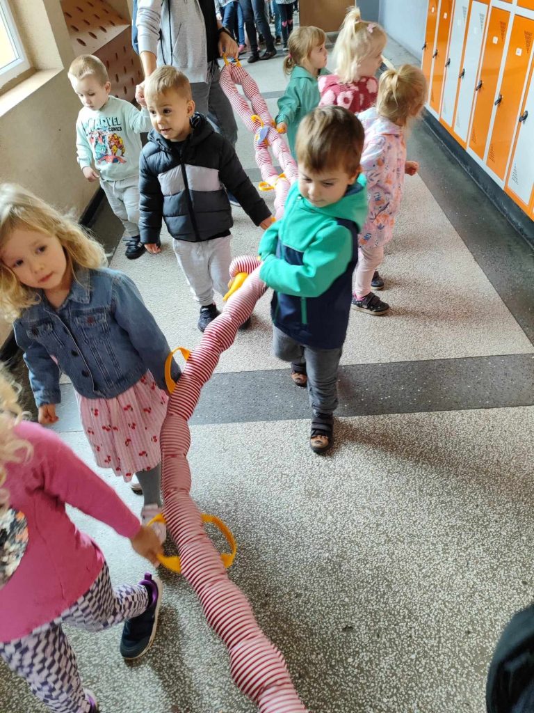 W naszym przedszkolu pojawiła się nowa towarzyszka – gąsienica, którą dzieci nazwały Gabrysia. Od teraz zabiera Biedroneczki na wesołe spacery i towarzyszy im podczas każdego wyjścia na dwór. Dzięki Gabrysi dzieci uczą się poruszania w grupie, ćwiczą cierpliwość i wzmacniają współpracę.