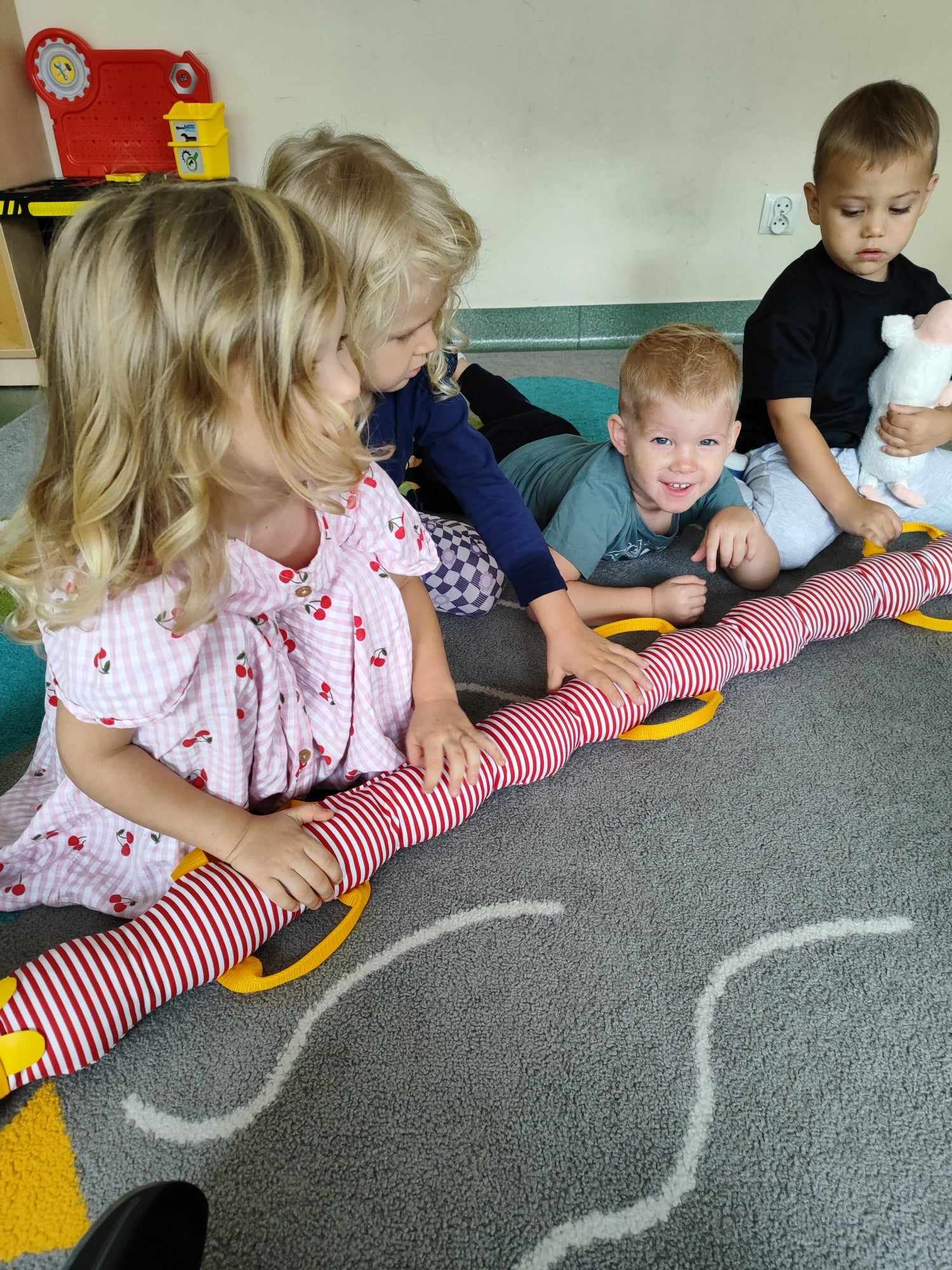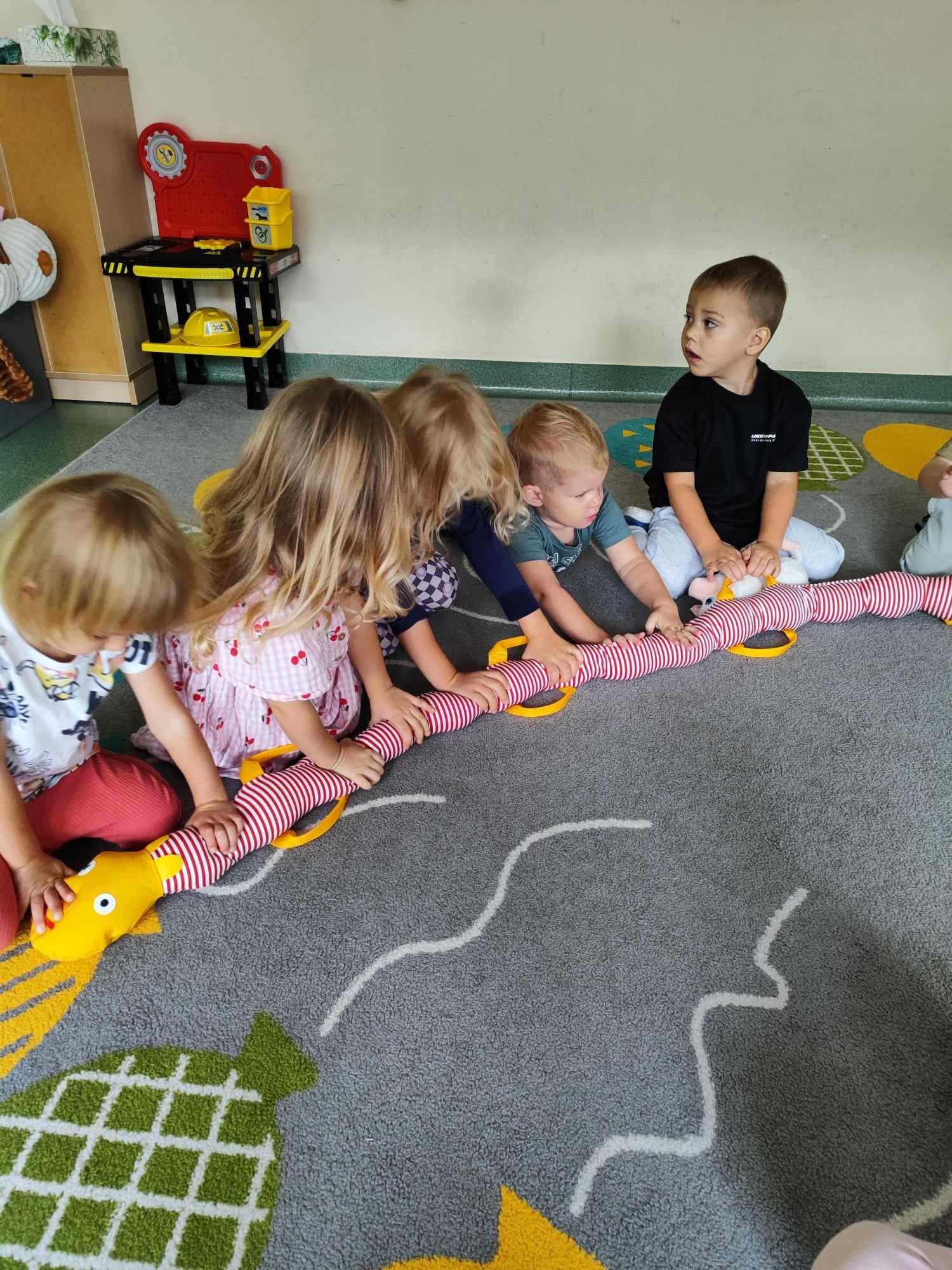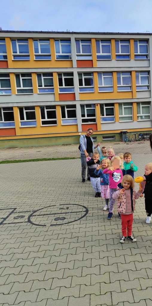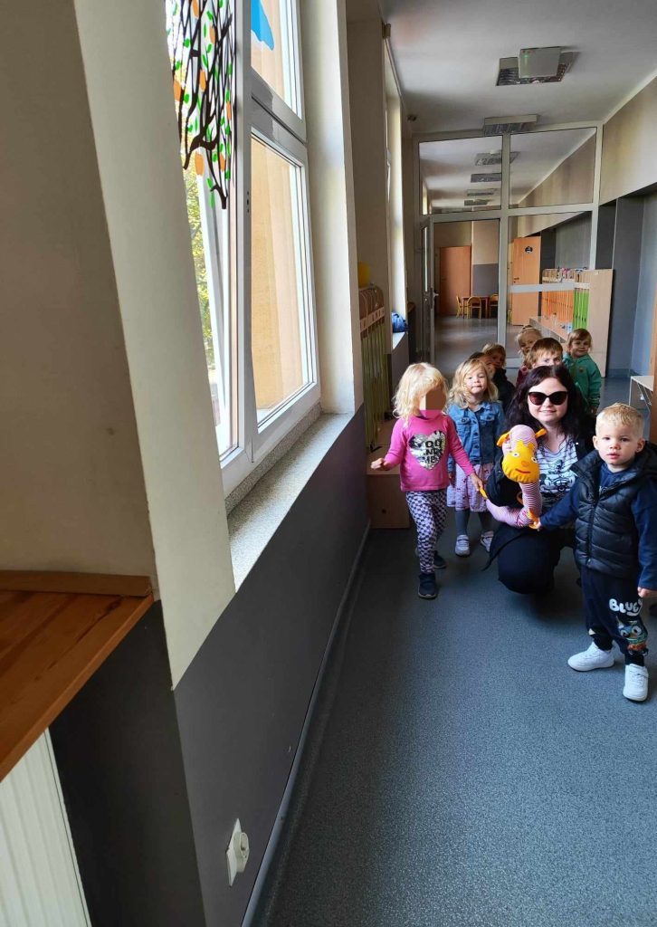 W naszym przedszkolu pojawiła się nowa towarzyszka – gąsienica, którą dzieci nazwały Gabrysia. Od teraz zabiera Biedroneczki na wesołe spacery i towarzyszy im podczas każdego wyjścia na dwór. Dzięki Gabrysi dzieci uczą się poruszania w grupie, ćwiczą cierpliwość i wzmacniają współpracę.