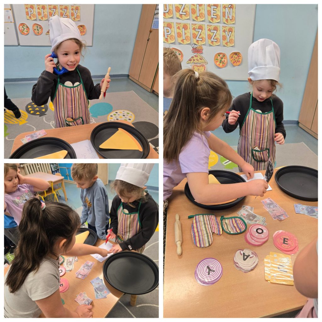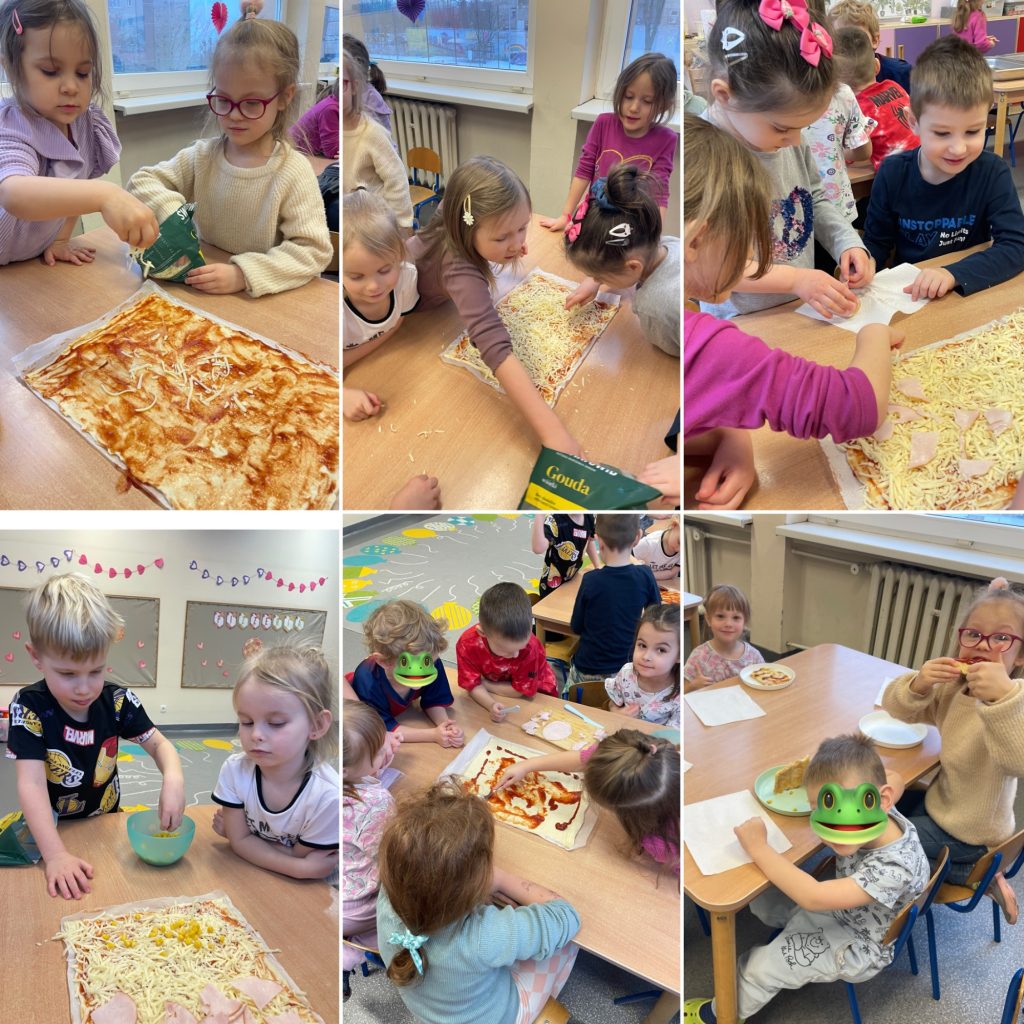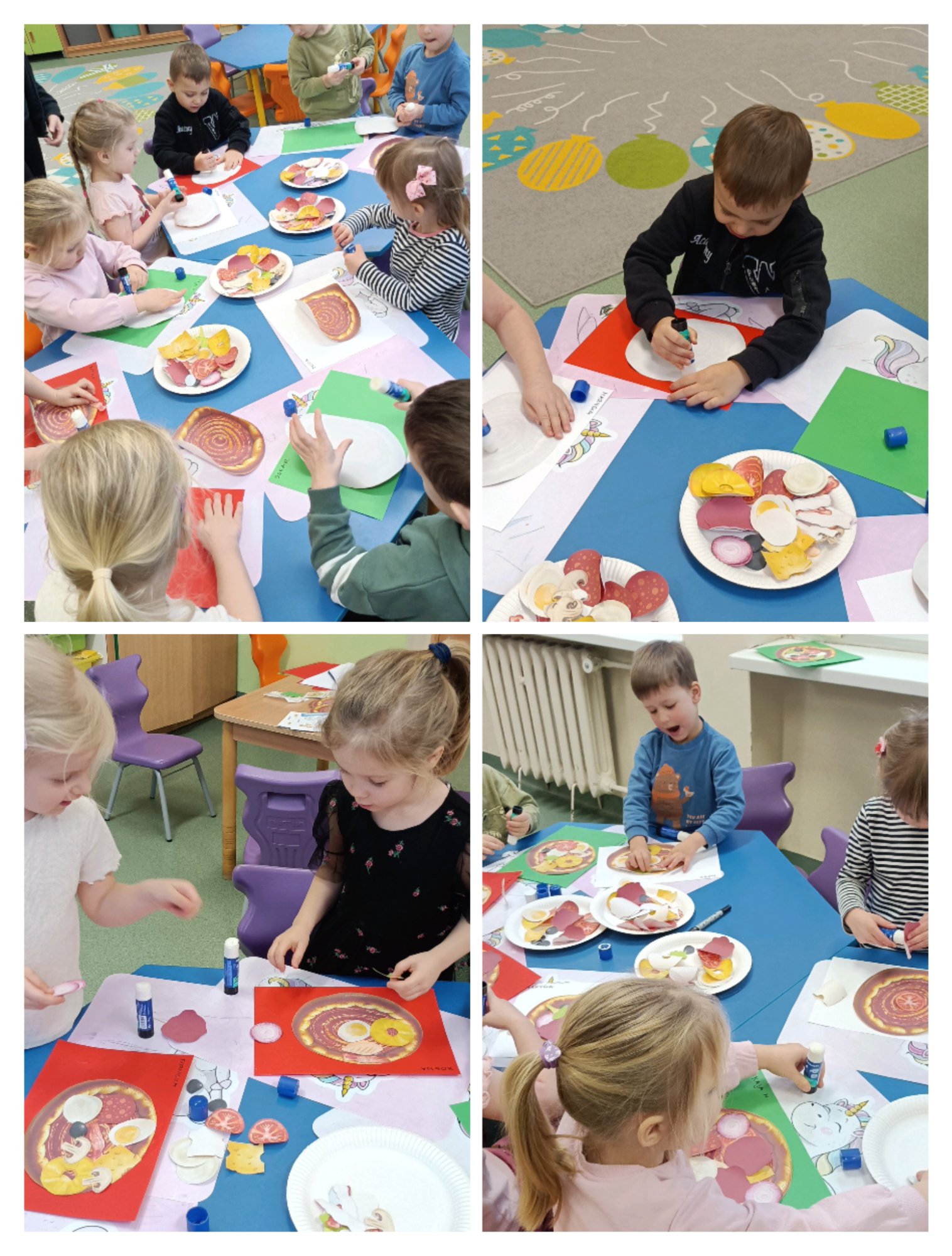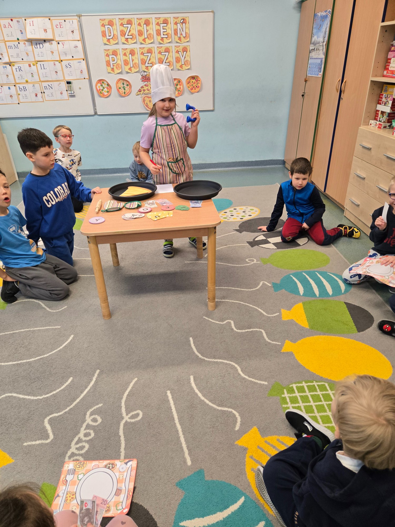 Grupy Misie i Żabki tworzyły pizze w przedszkolu, wcielając się w role pizzermenów i kelnerów – odbierały zamówienia, przygotowywały składniki i komponowały kolorowe pizze. Było mnóstwo śmiechu, zabawy