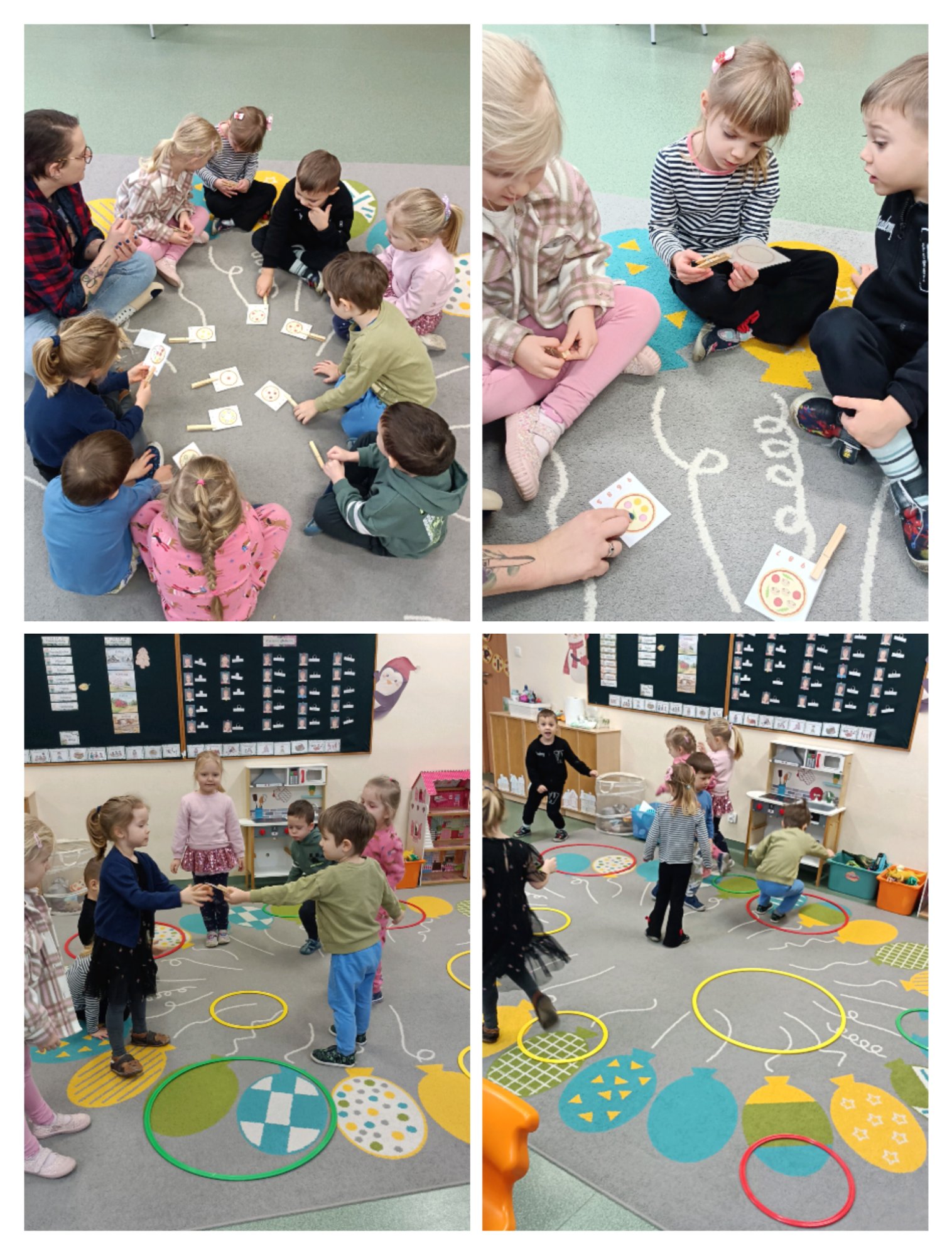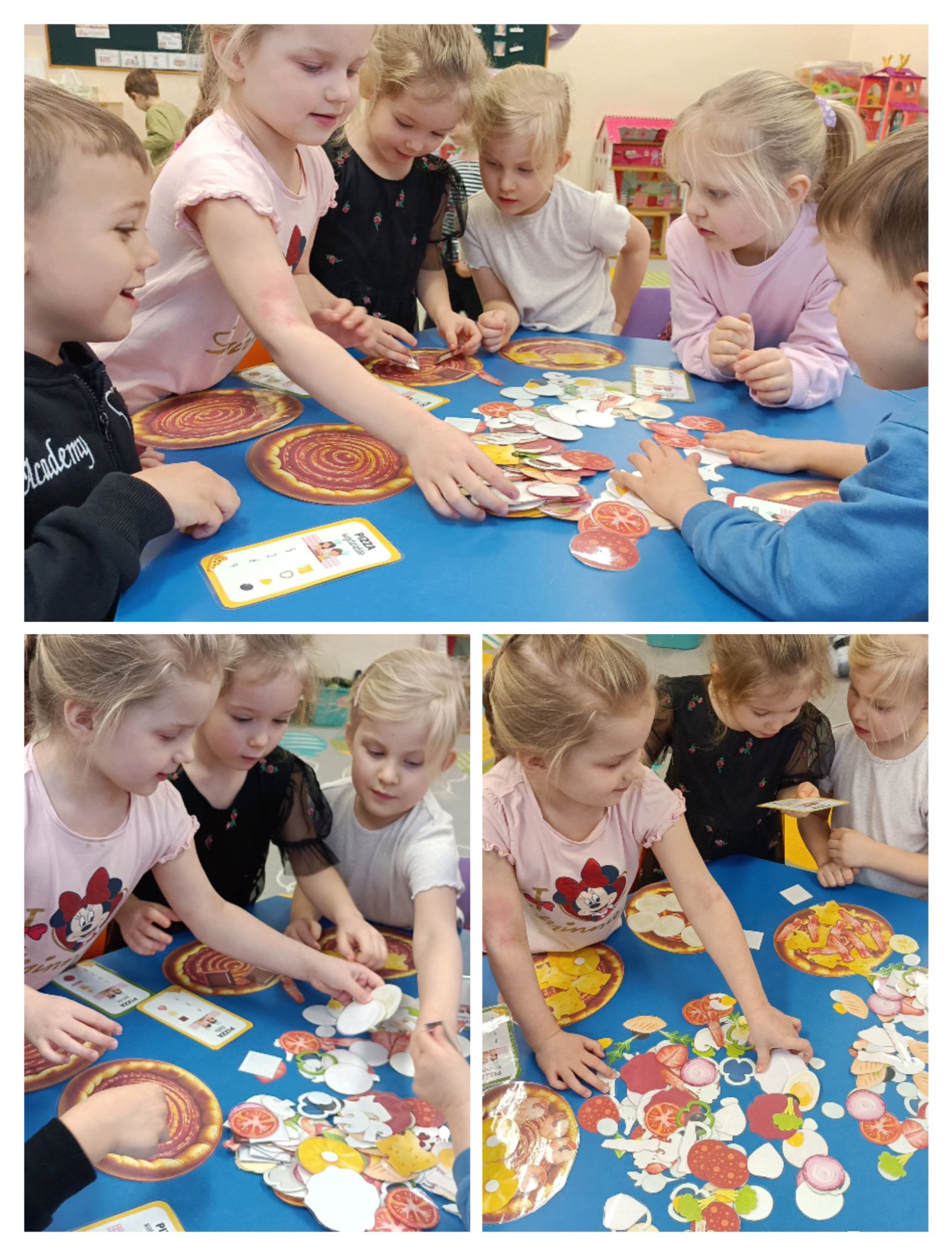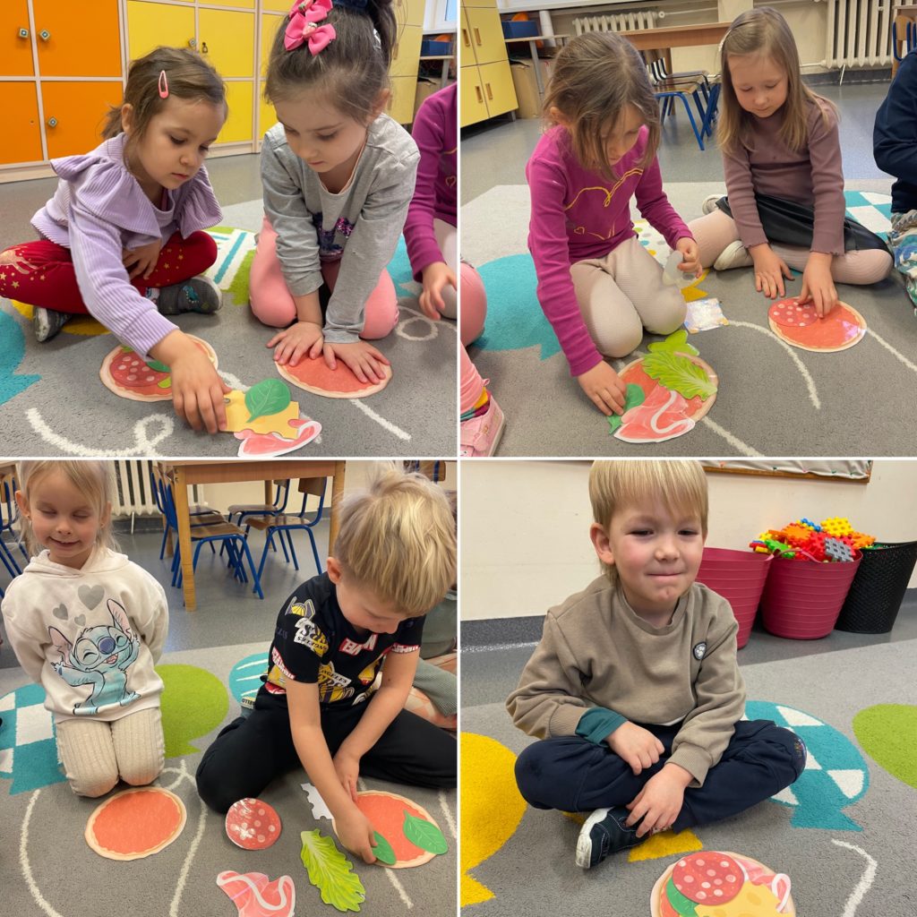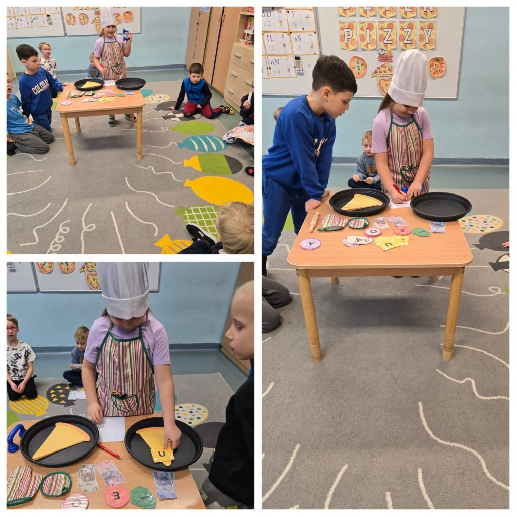 Grupy Misie i Żabki tworzyły pizze w przedszkolu, wcielając się w role pizzermenów i kelnerów – odbierały zamówienia, przygotowywały składniki i komponowały kolorowe pizze. Było mnóstwo śmiechu, zabawy