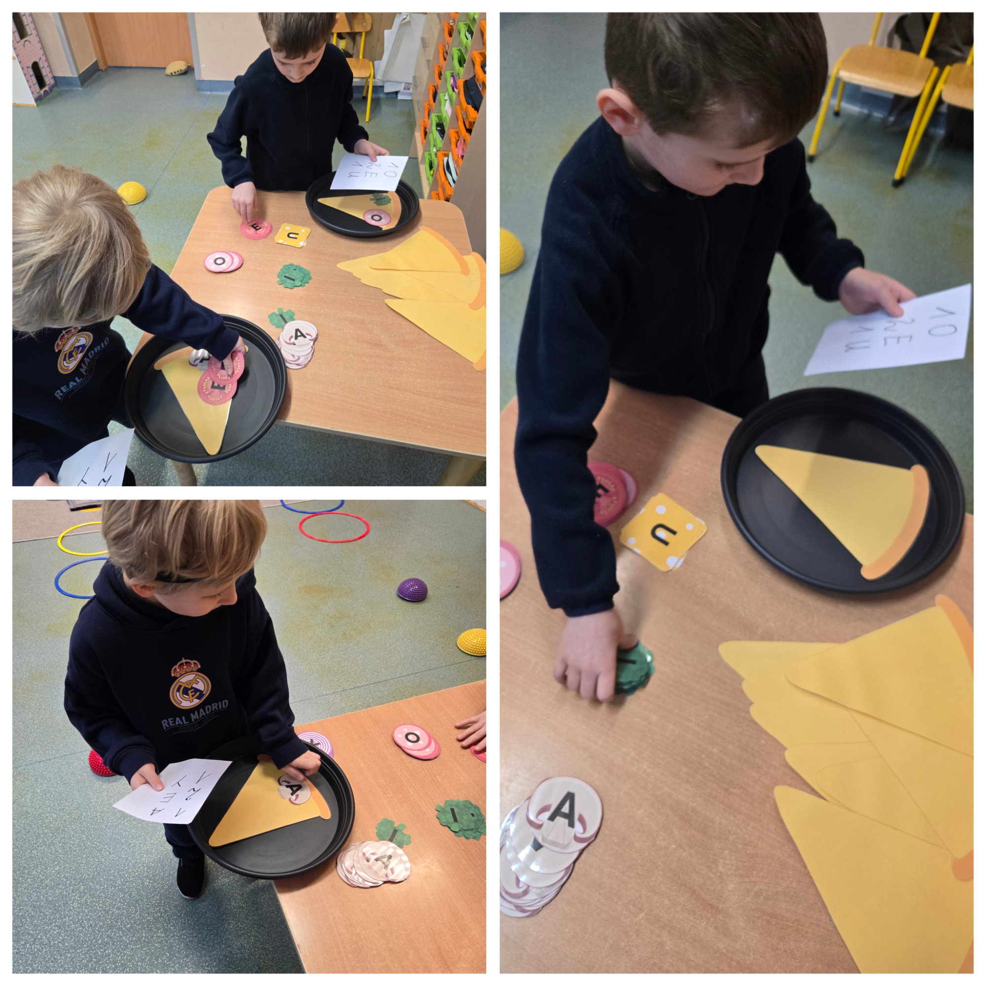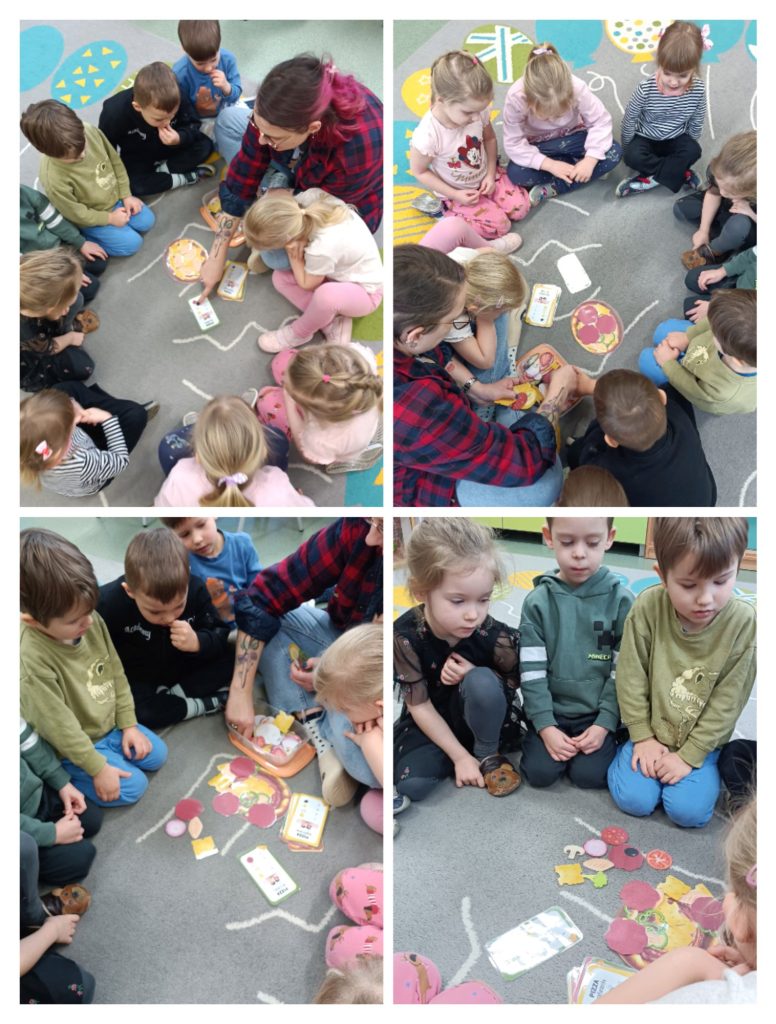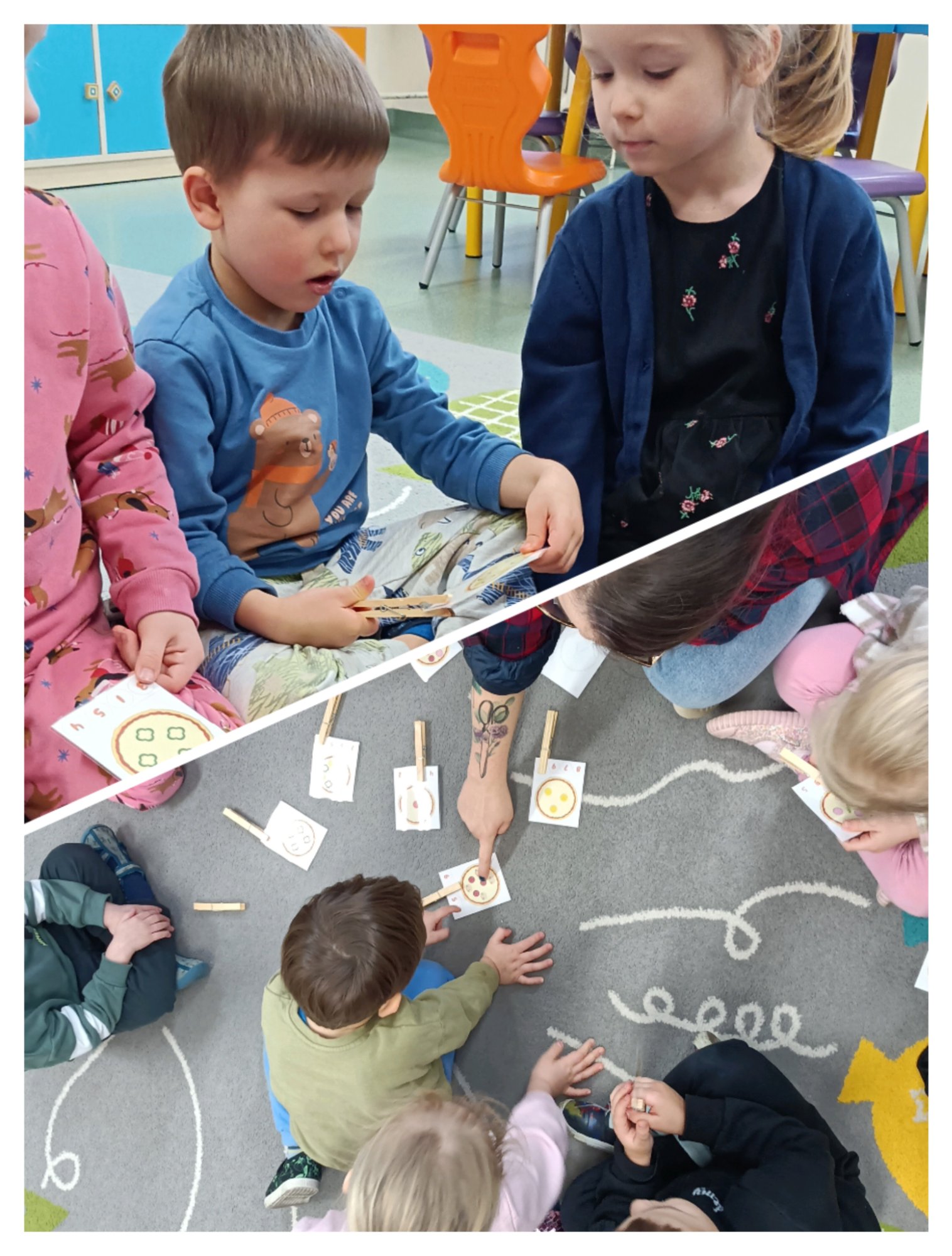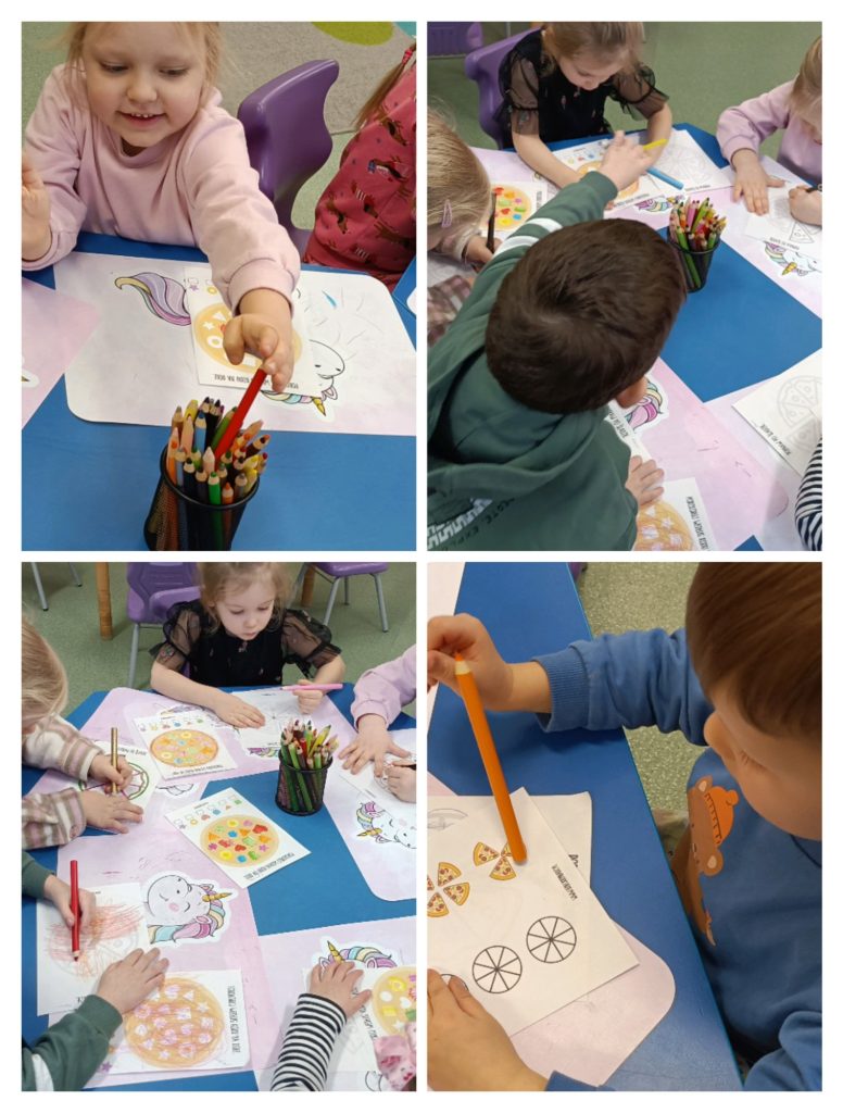 Grupy Misie i Żabki tworzyły pizze w przedszkolu, wcielając się w role pizzermenów i kelnerów – odbierały zamówienia, przygotowywały składniki i komponowały kolorowe pizze. Było mnóstwo śmiechu, zabawy