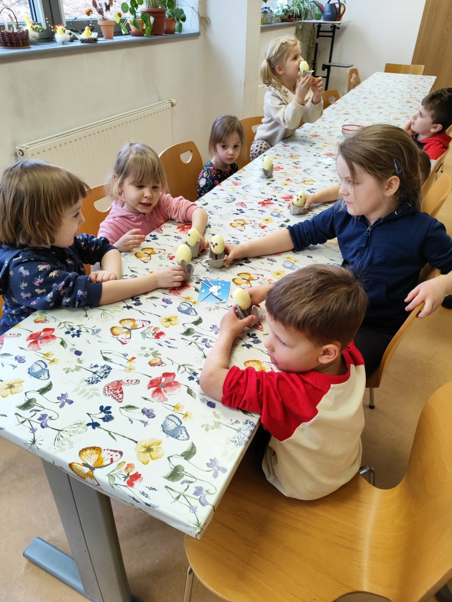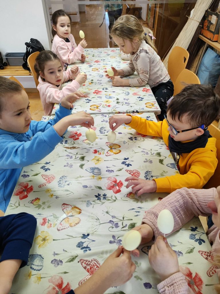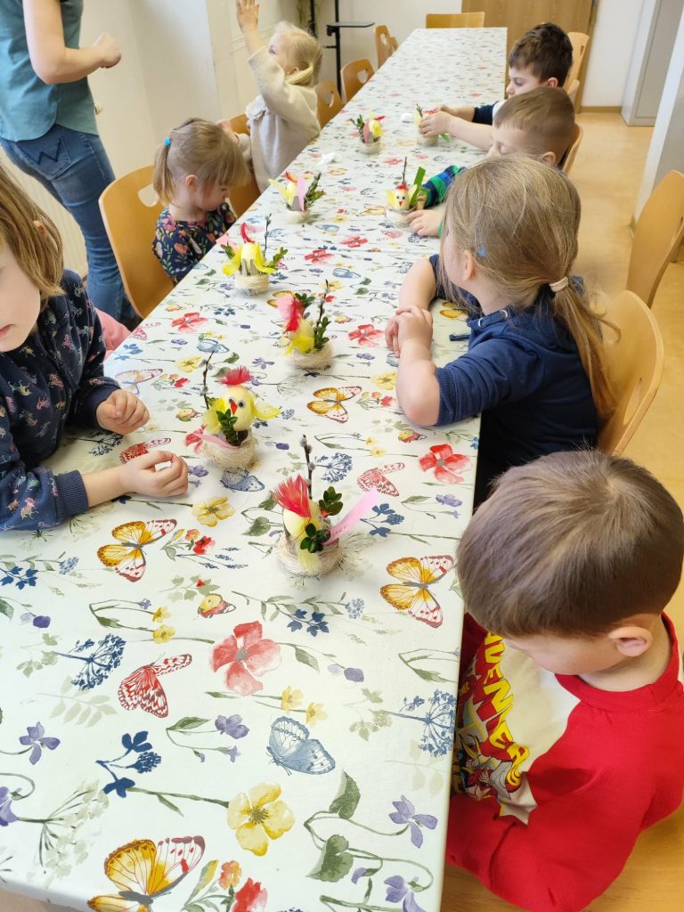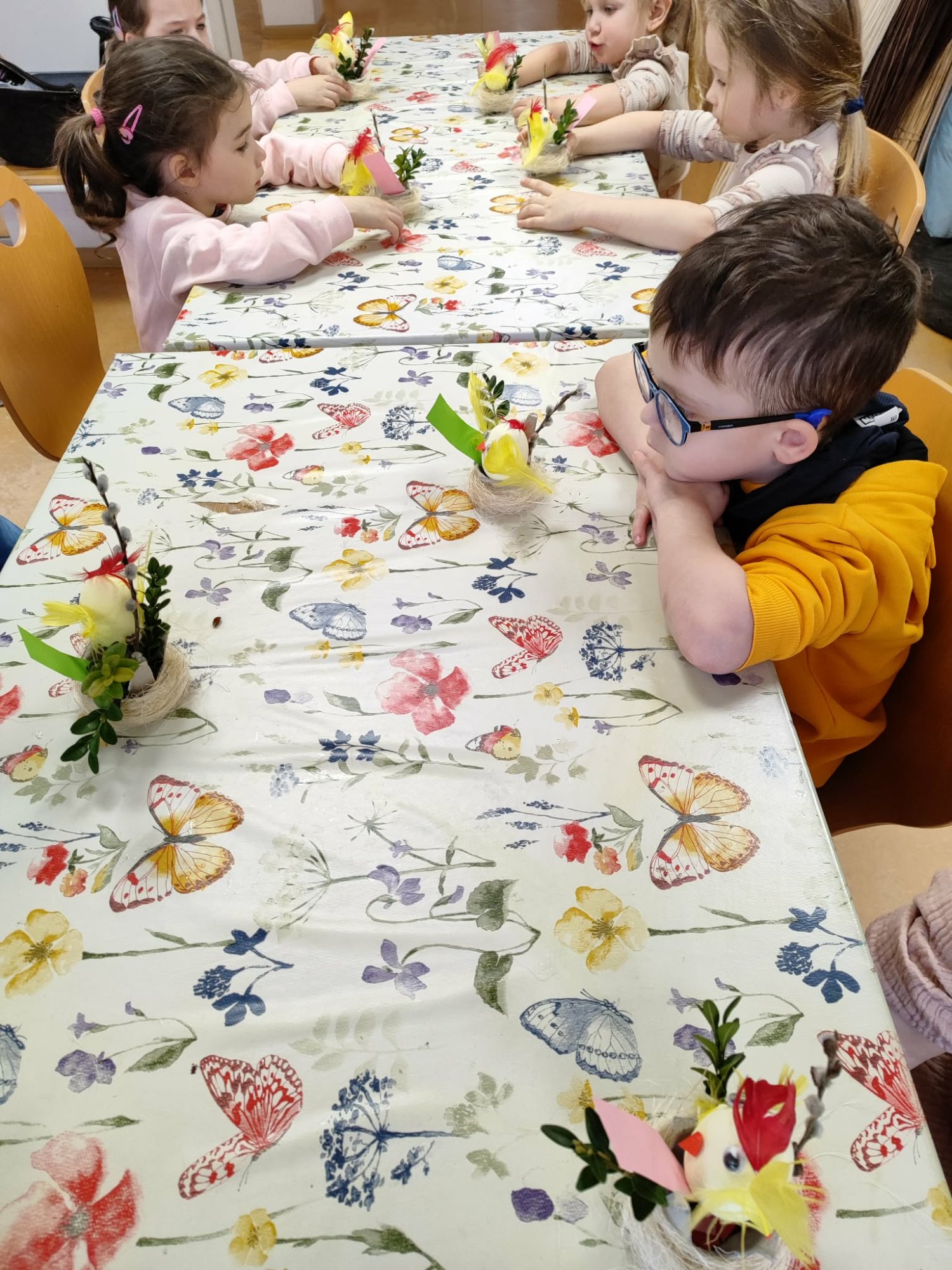 Po emocjonującej zabawie dzieci wykonały własne stroiki wielkanocne, w których główną rolę odgrywał