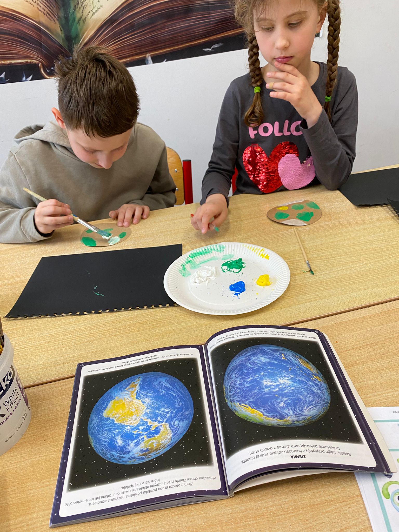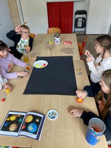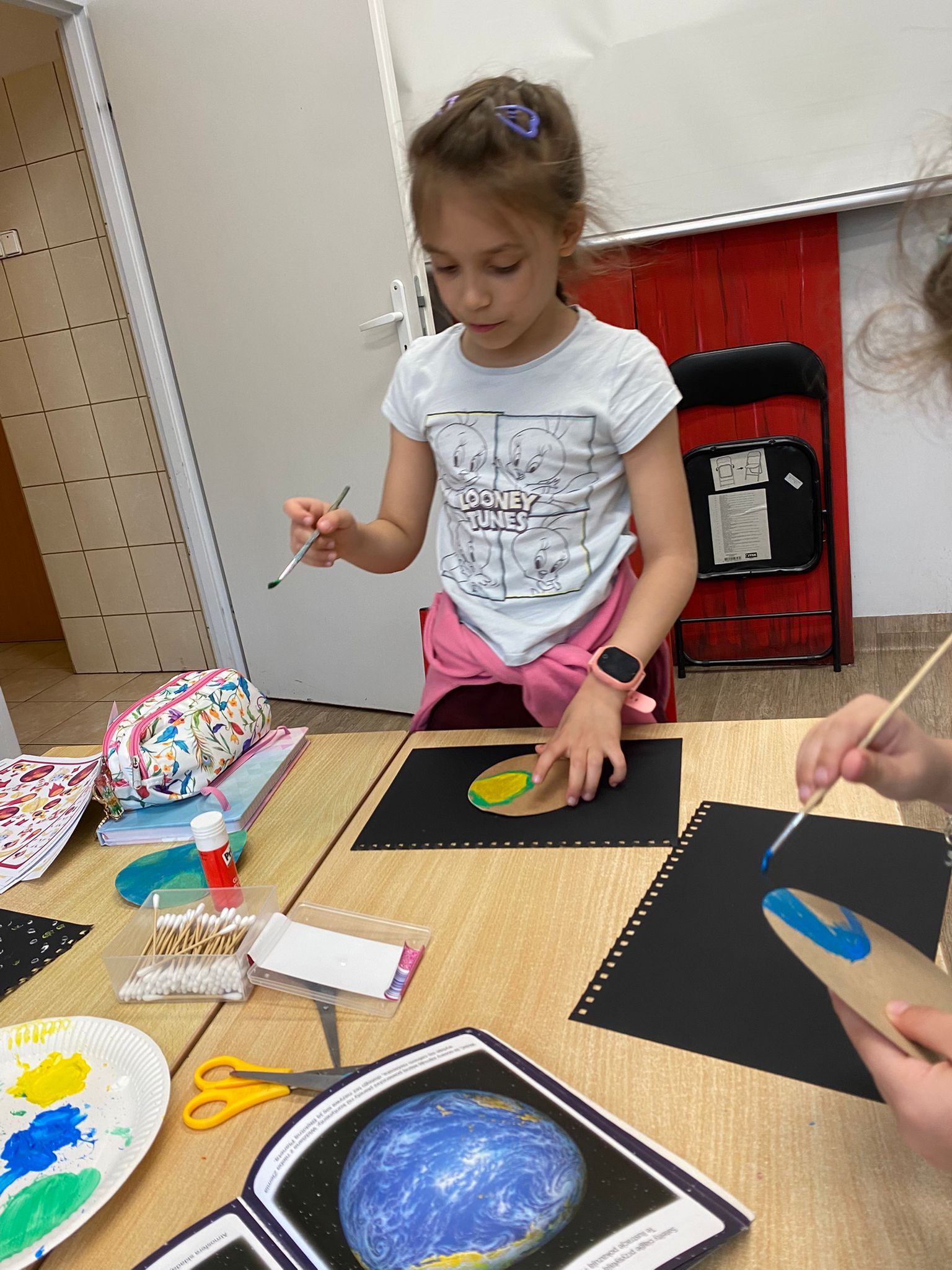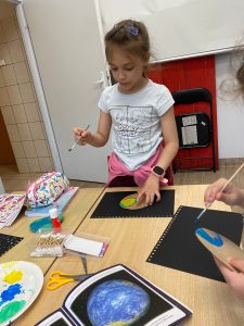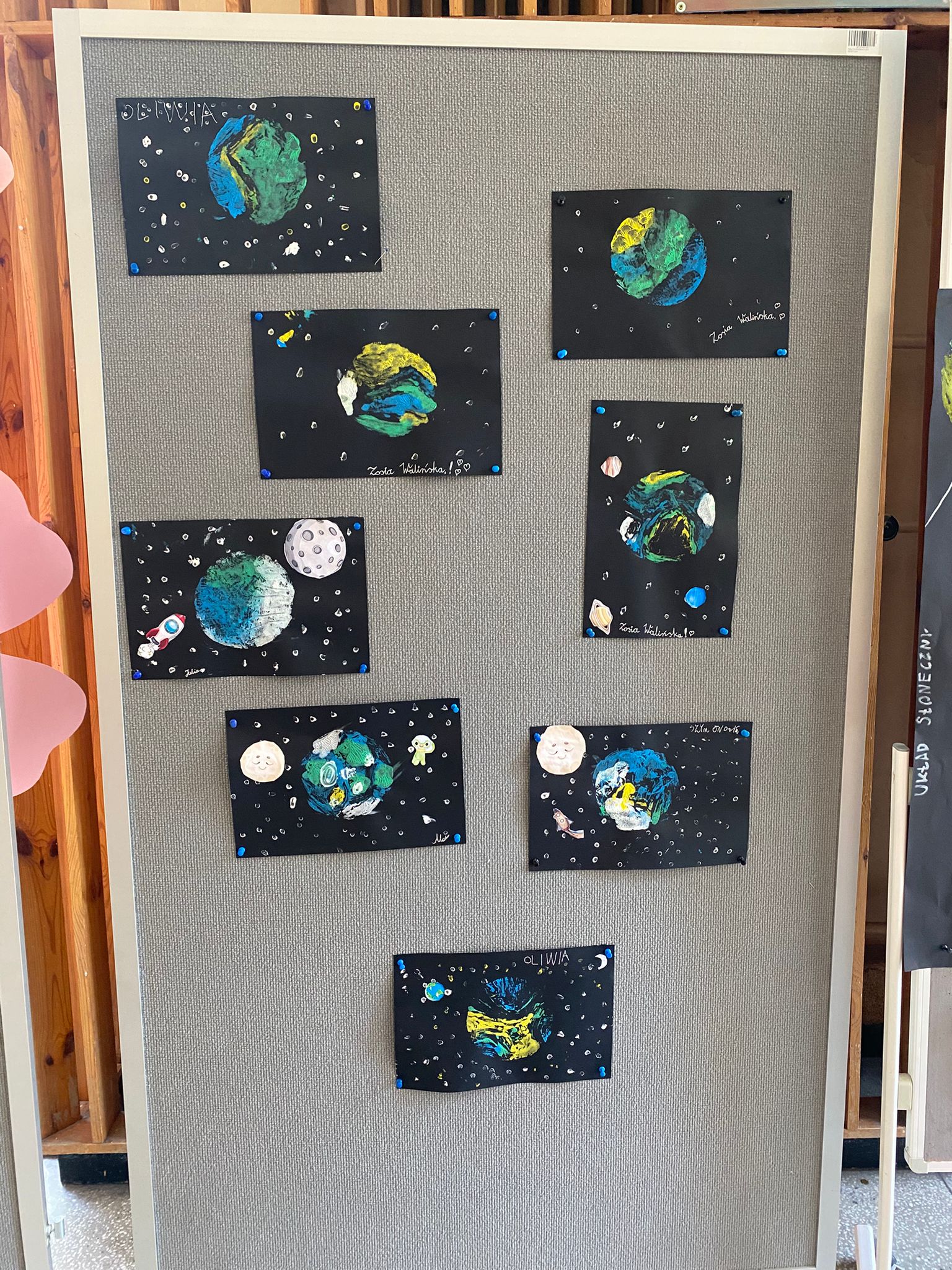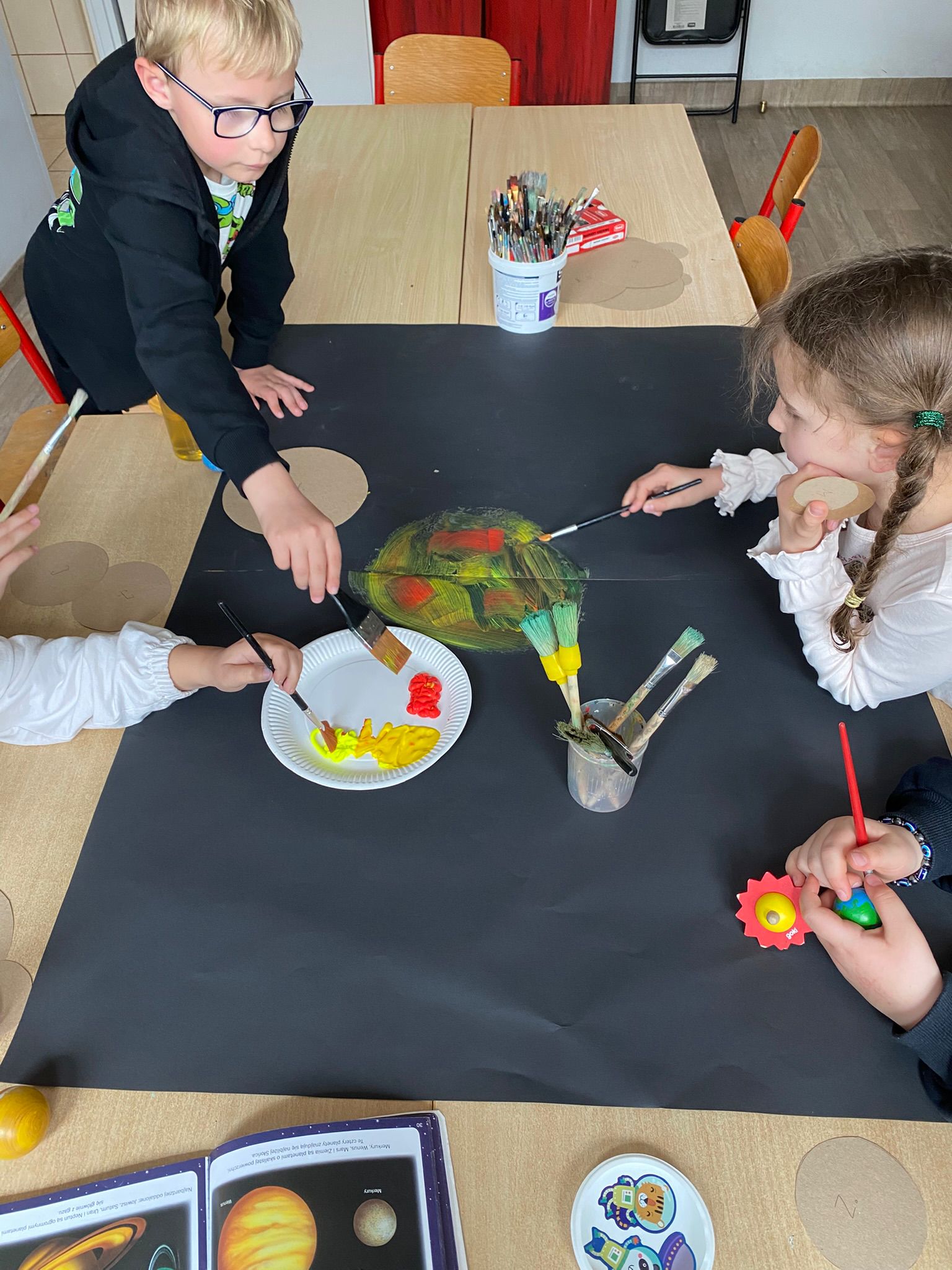 W ramach projektu „Aktywna Świetlica. Mali odkrywcy” w tym tygodniu przenieśliśmy się w kosmos. Najpierw na dużym formacie stworzyliśmy Układ Słoneczny. Dzięki temu poznaliśmy wszystkie osiem planet. Następnie skupiliśmy się na naszej planecie Ziemi, ze względu na jej święto w najbliższych dniach. Tworząc kosmiczne kolaże rozmawialiśmy o sposobach dbania o błękitną planetę i znaczeniu naszych małych działań, by ją chronić🙂