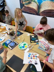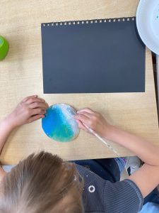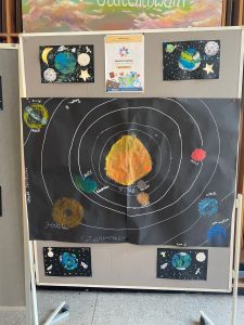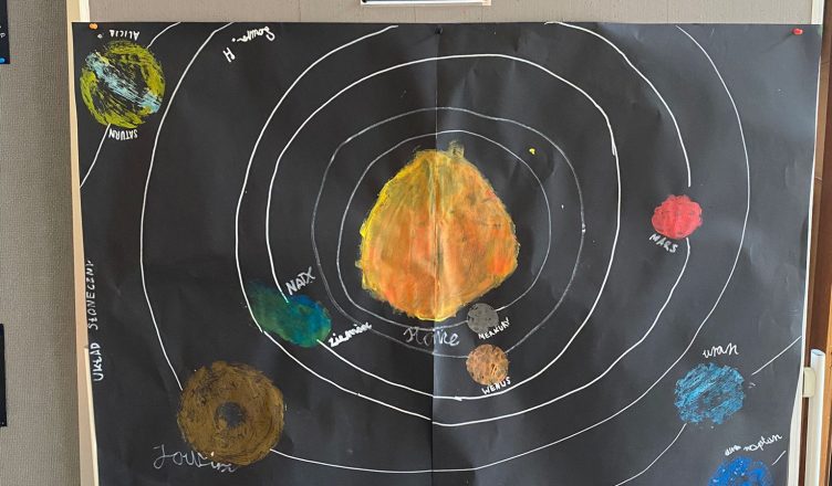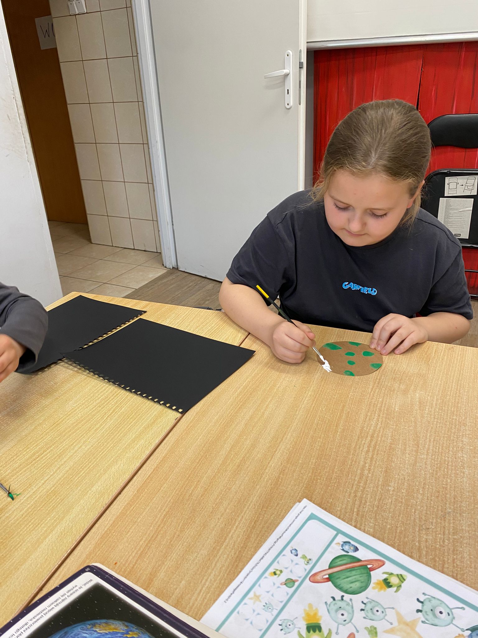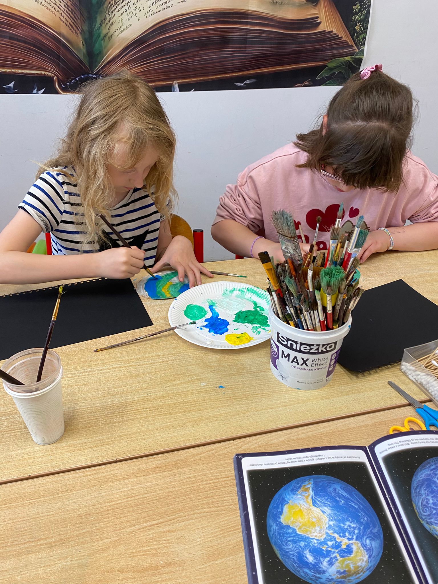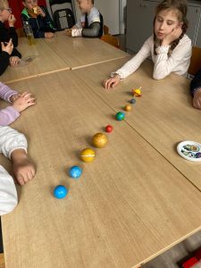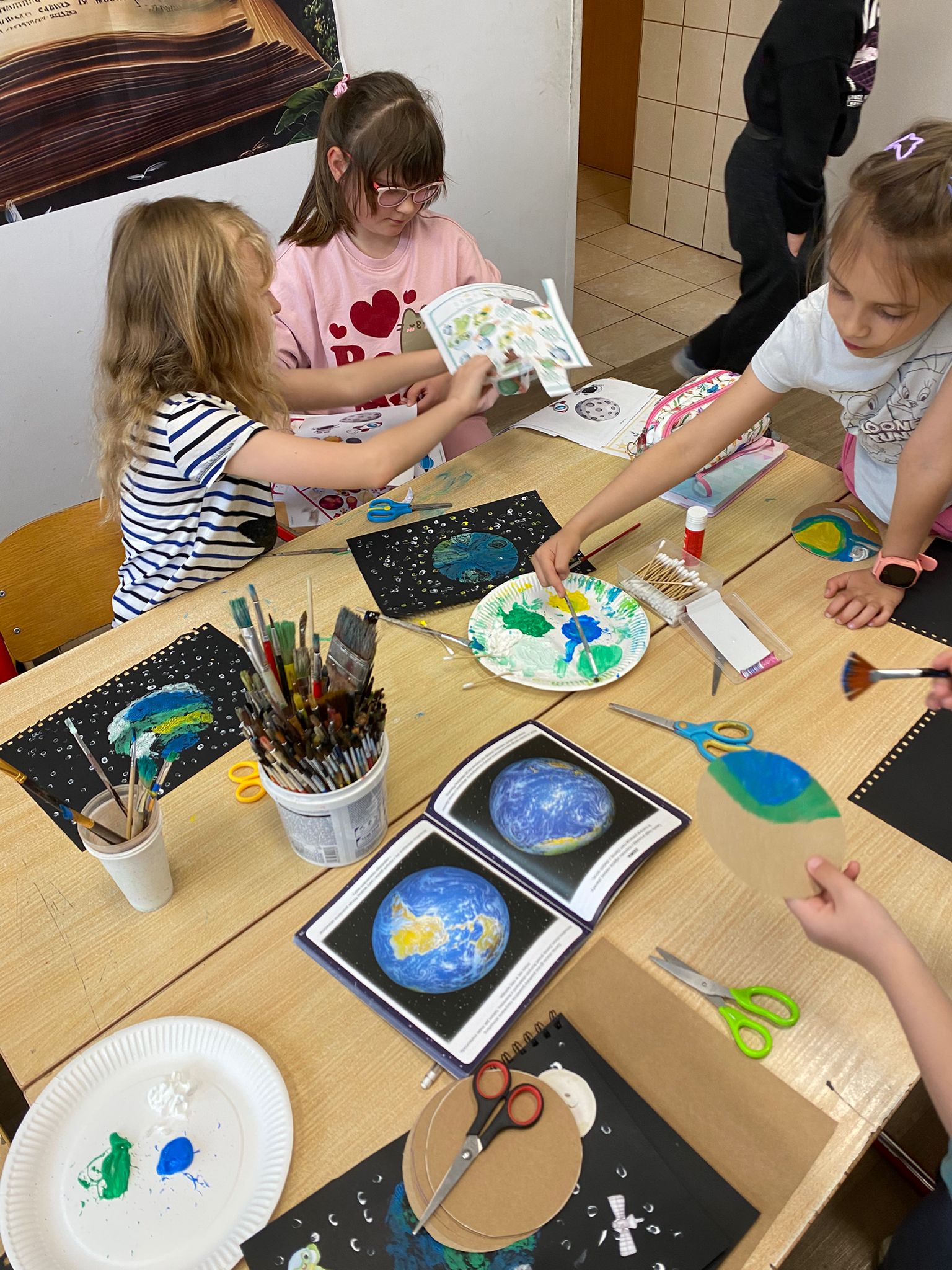 W ramach projektu „Aktywna Świetlica. Mali odkrywcy” w tym tygodniu przenieśliśmy się w kosmos. Najpierw na dużym formacie stworzyliśmy Układ Słoneczny. Dzięki temu poznaliśmy wszystkie osiem planet. Następnie skupiliśmy się na naszej planecie Ziemi, ze względu na jej święto w najbliższych dniach. Tworząc kosmiczne kolaże rozmawialiśmy o sposobach dbania o błękitną planetę i znaczeniu naszych małych działań, by ją chronić🙂