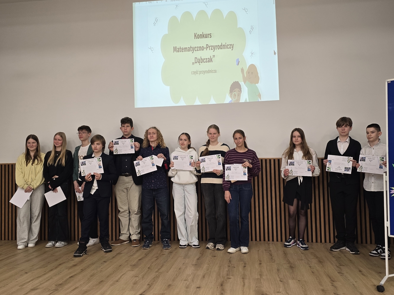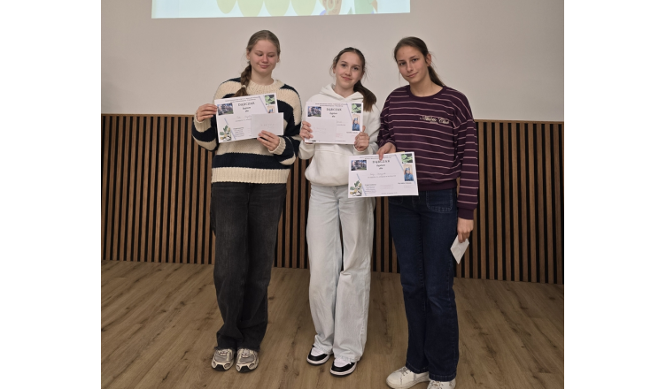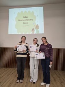 Drużyna z klasy 7B w składzie: Ewa Skrzypek, Pola Szydłowska i Viktoriia Irynchuk zajęła 3 miejsce w międzyszkolnym konkursie matematyczno-przyrodniczym „Dąbczak”, podczas którego wykazała się wiedzą na temat przyrody i historii Wildy oraz umiejętnościami matematycznymi. Gratulujemy!