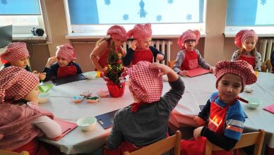 Przedszkolaki z grup: Sowy i Żabki w ramach prezentu mikołajkowego uczestniczyły w Warsztatach Kulinarnych, podczas których wykonały piernikowe choinki. Każde z dzieci otrzymało